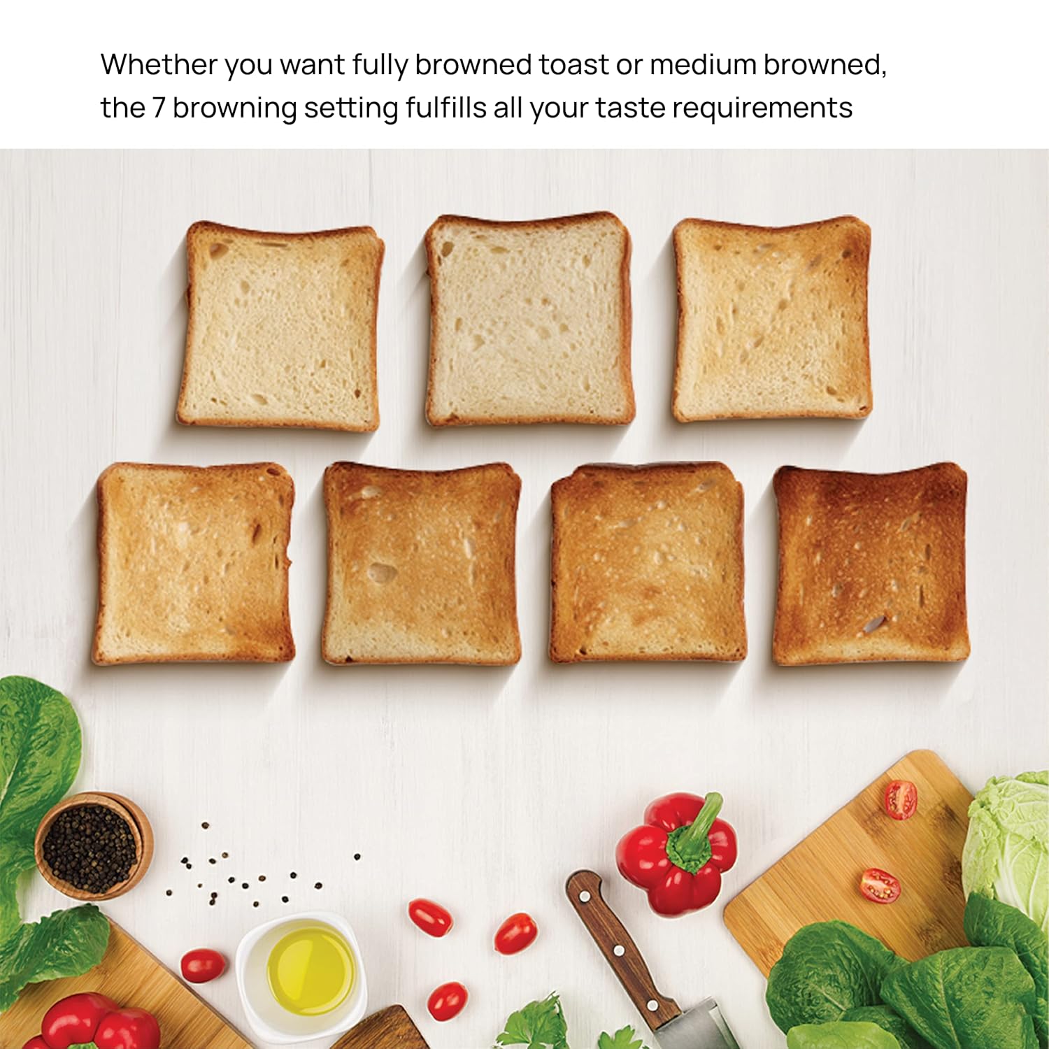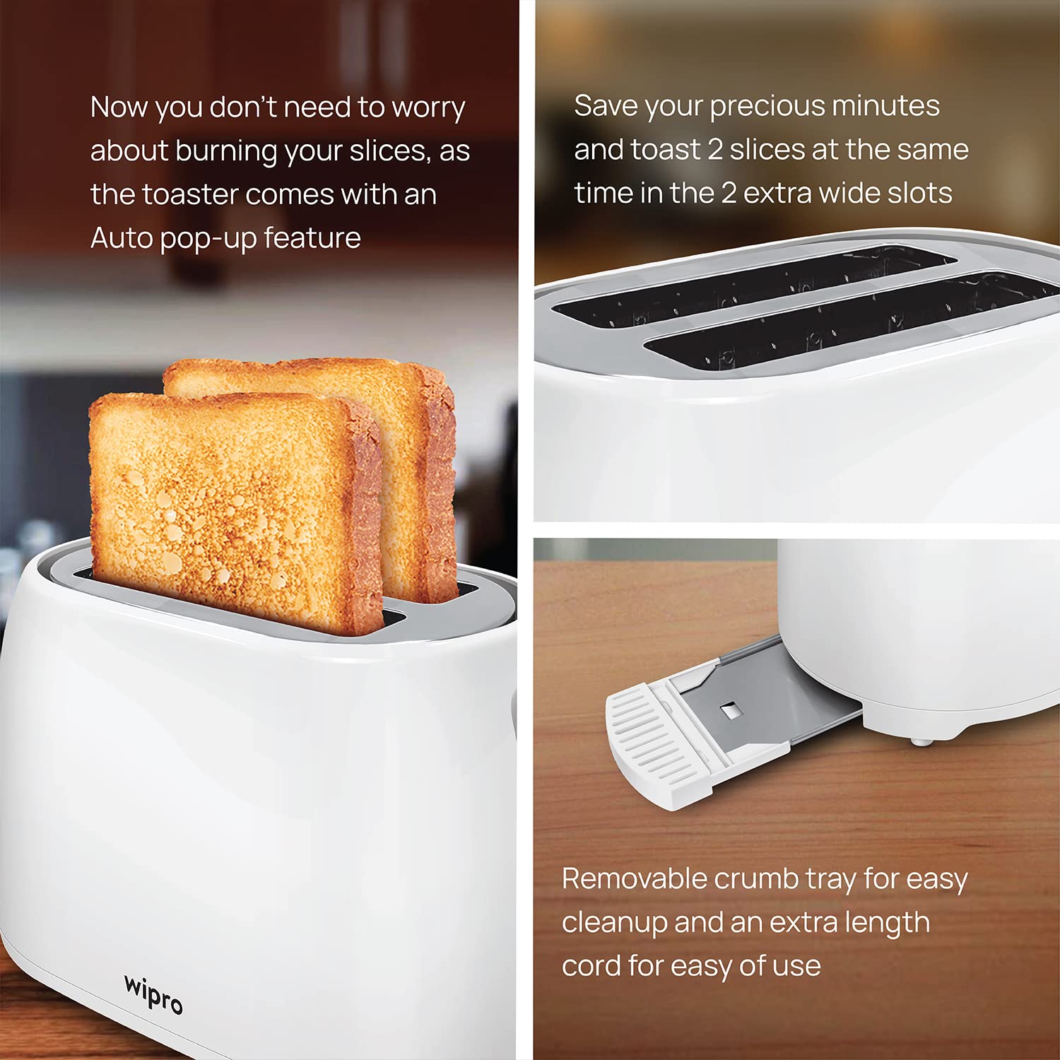 Wipro Vesta Bread Toaster BT101 750 Watts Auto Pop up with Removable Crumb Tray, 7 Browning Levels (White), Standard